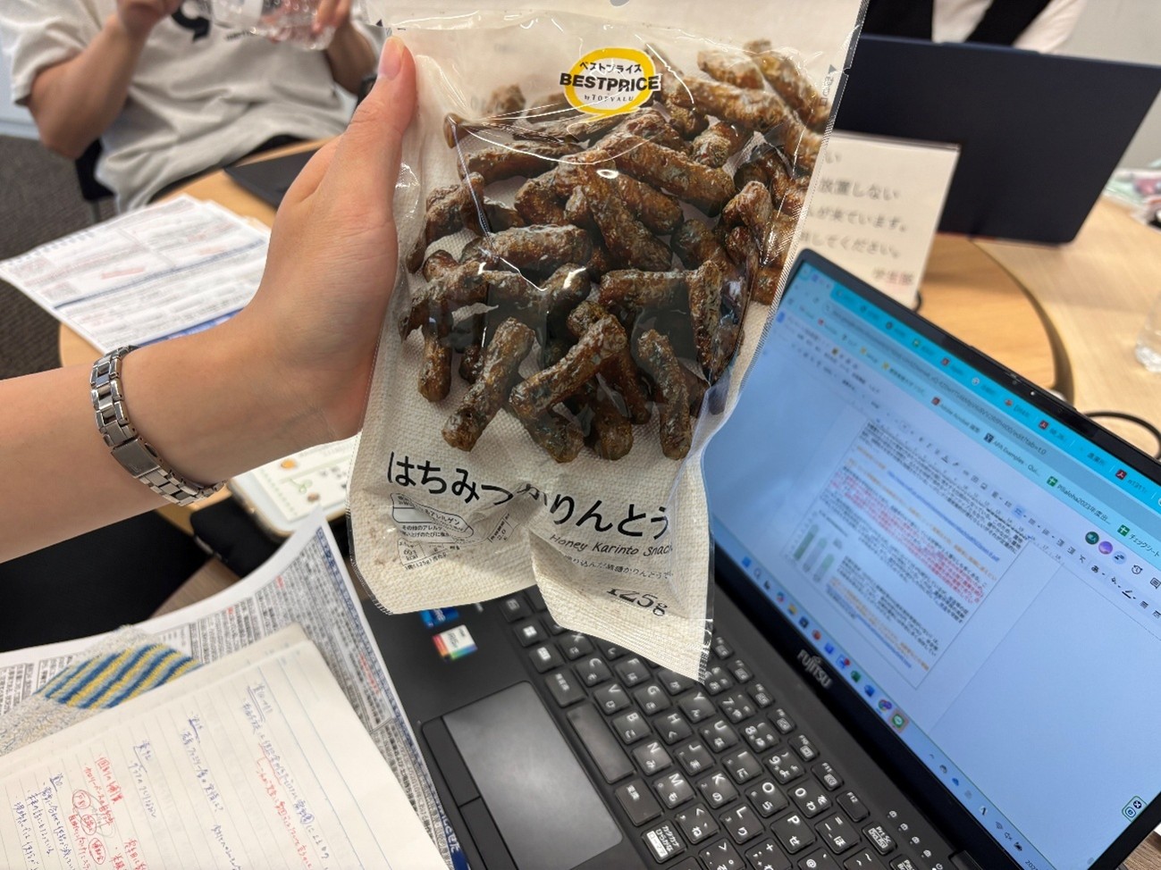 前回のブログでグループワークにおいて、各々が準備をして臨むことが大切だという「おみやげ」の話をしましたが、それぞれが資料を探してきたり、相手の資料の矛盾をまとめてきたりと、もはや当たり前におみやげを持参している同期ばかりで本当に感心します。最近はリアルなおみやげ(じゃがりこなどなど)を持ってきてくれる同期が増えて、作業の合間にみんなでポリポリしています。