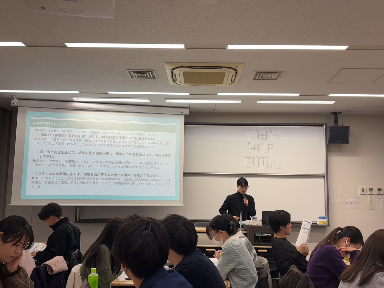 続いて5限は、とうまさんによるふるさと納税についての発表でした。ふるさと納税って、一部の自治体に寄附が集中していますよね。とうまさんの研究は、単に「有名な特産品があるから」という理由だけでなく、もっと深い要因があるのではないかという視点からの分析でした。