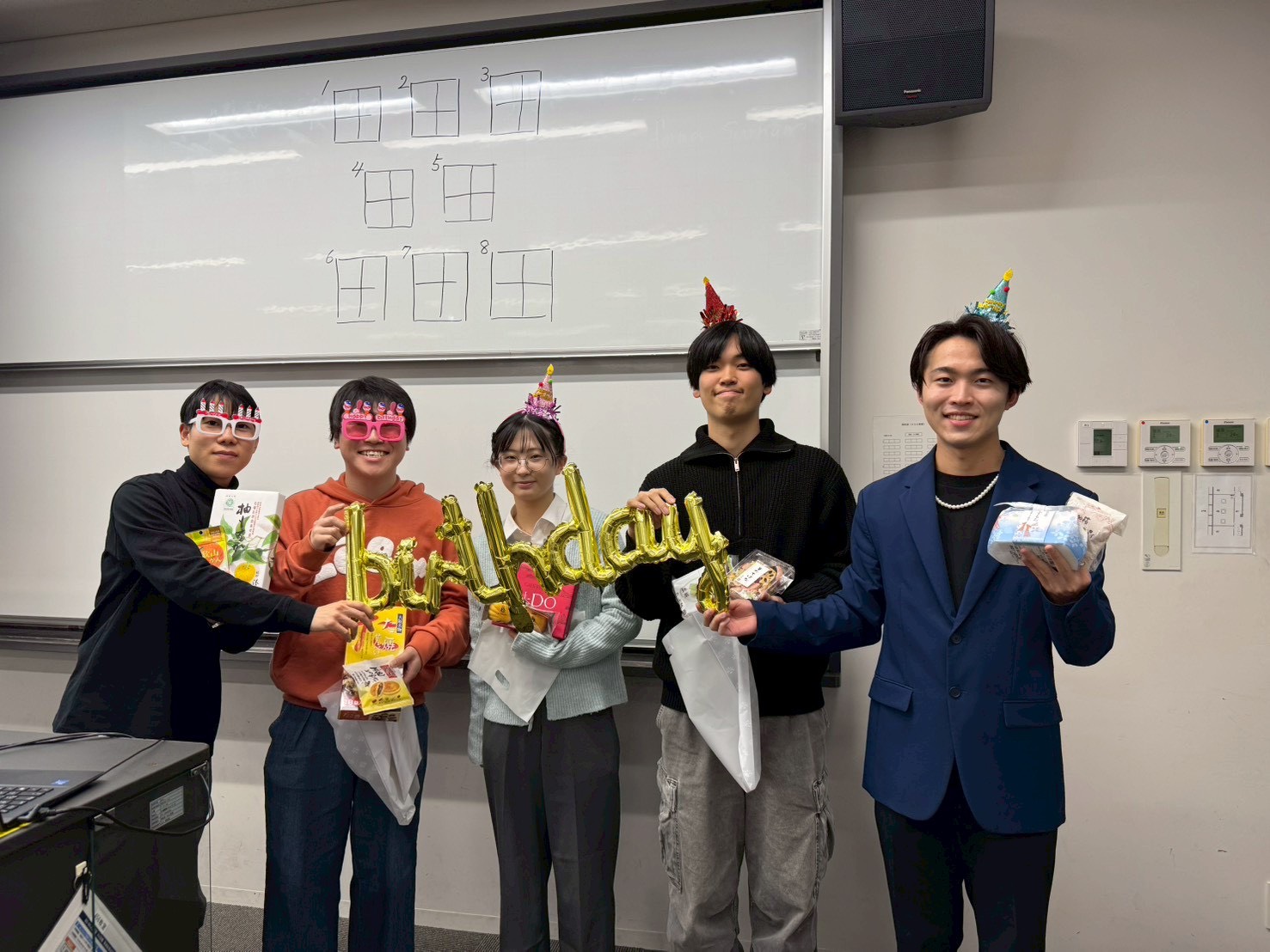 そして、お二人の発表の後には11月と12月の誕生日のゼミ員をみんなでお祝いしました!誕生日を迎えたゼミ員へ、企画係の皆さんから日本各地のご当地お土産やお菓子が贈られました。素敵なプレゼントを用意してくれた企画係の皆さん、ありがとうございます!そして誕生日のみんな、おめでとう~!